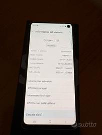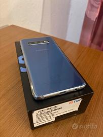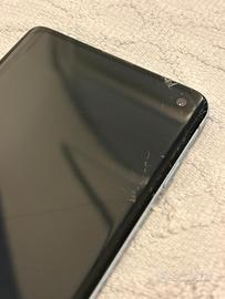 Vendo Samsung Galaxy S10 nella colorazione Prism Blue, versione con 8GB di RAM e 128GB di memoria interna (espandibile). Condizioni del telefono: • Funzionamento: Il dispositivo è perfettamente funzionante in ogni sua parte (fotocamere, audio, sensore impronte, ricarica wireless). • Schermo: A causa di una caduta, il vetro anteriore presenta delle crepe (come da foto). Tuttavia, il touch screen funziona correttamente su tutta la superficie e il display non presenta macchie o righe nere. • Estetica: Il retro e i bordi sono in ottimo stato.