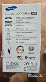 Samsung Galaxy S3 Mini bianco I8190 8 Gb. Funzionante. Presenta solo qualche scheggiatura sui bordi come da foto. Con una cover dovrebbero venire coperte. Inclusi cavo e scatola. Dettagli in foto. Consigliato l'acquisto per pezzi di ricambio o per l'utilizzo da parte di bambini o anziani, solo per chiamate, sms, internet, foto e app preistallate, in quanto la versione Android è 4.1 e non permette l'utilizzo del play store e di conseguenza di scaricare qualsiasi applicazione (tra cui WhatsApp, Facebook, instagram ecc).