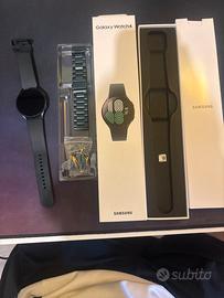 Samsung Galaxy Watch 4 LTE colorazione : verde scuro Extra incluso : cinturino in maglia verde scuro elegante Finzionalità orologio: Tutti i tipi di sport (anche in acqua) Gps Messaggi (ricezione e risposta) Chiamate (entrata e uscita) Microfono implementato Meteo Gran parte delle applicazioni del telefono possono essere messe anche sull’orologio Cavo di ricarica wireless incluso (leggermente danneggiato) funzionante