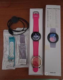 Vendo Samsung Galaxy Watch5 40mm, in ottime condizioni, perfettamente funzionante. Lo smartwatch è completo di scatola originale e caricatore magnetico. Inclusi anche 2 cinturini aggiuntivi nuovi (come da foto), oltre al cinturino rosa già montato più copri vetrino in silicone. Ideale per monitorare: - attività sportiva - frequenza cardiaca - sonno - notifiche da smartphone Caratteristiche principali: - Display AMOLED luminoso - GPS integrato - Monitoraggio salute e fitness - Compatibile con smartphone Android - Resistente all’acqua NO PERDITEMPO. PREZZO POCO TRATTABILE.