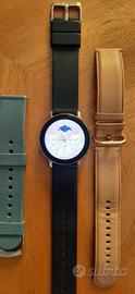 Galaxy Watch Active 2 con cassa in acciaio (non in alluminio) dorato, cinturino in pelle, due cinturini in silicone di riserva e seconda base di ricarica.