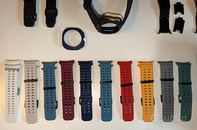 Include: 4 cinturini in acciaio e titanio con maglie per allungarli e toglimaglie, 1 cinturino rugged nero, 1 cinturino sport nero e 12 cinturini colorati in vari colori come da foto. Includo anche due ghiere di protezione, colore titanio e blu.