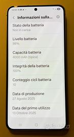 Vendo Samsung S25 256gb, colore Silver Shadow, acquistato il 06/10/2025, Garanzia Italia, garantito fino ad ottobre 2027, come nuovo, usato pochissimo - cicli di ricarica n.10 e integrità batteria al 100% - perfettamente funzionante, no urti o graffi, intonso.