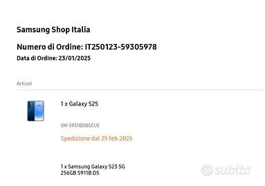 Vendo Samsung galaxy S25 256 gb, tenuto in maniera perfetta, colore blu. Completo di scatola originale, cavo ricarica USB e due cover originali in silicone. Nelle foto potete trovare ricevuta acquisto dal sito Samsung, unico proprietario. Garantisco spedizione con massima rapidità.