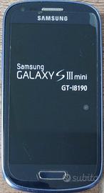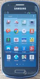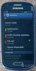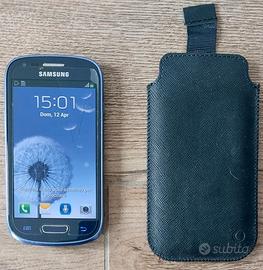 Samsung Galaxy SIII mini colore Pebble Blue in ottime condizioni. Batteria originale, durata circa 3 giorni acceso senza utilizzo; schermo perfetto ( i segni in foto sono dovuti a bolle d'aria presenti nella pellicola di protezione che si può togliere senza problemi). Custodia come da foto in regalo. Sistema operativo Android 4.1.2, batteria da 1500mAh, fotocamera da 5 MP con flash posteriore e 0,3 MP anteriore, display WVGA 4,0" e archiviazione 4,5GB liberi (come da foto) + microSD. Bluetooth, Wi-Fi, vivavoce, lettore MP3 e radio FM.