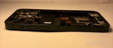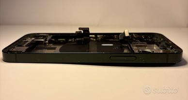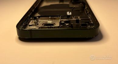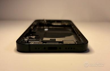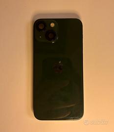 Vendesi back cover, scocca per Iphone 13 mini, colore verde, originale smontata da dispositivo guasto, leggeri segni di usura lungo le bordature, retro intatto.