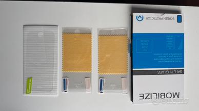 Lotto di 3 screen: 2 pellicole morbide resistenti e 1 protector in vetro temperato 0.33mm Safety Glass del marchio Mobilize, specifici per iPhone SE/5/5s/SE (2016) 4”, con bordi 2.5D arrotondati anti-graffio, oleofobico, alta trasparenza HD e durezza 9H