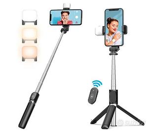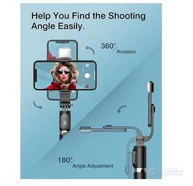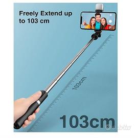 Tripod per smartphone a 360° con selfie stick leggero e telecomando Bluetooth. Compatibile con iPhone e Android per selfie, viaggi, trucco, vlog. Il selfie stick è dotato di un telecomando Bluetooth con portata fino a 10 m. Tenere premuto per accendere la luce. Sono disponibili diversi livelli di luminosità. Luce si ricarica con micro-USB. Rotazione a 360° e inclinazione a 180°. Con questo design puoi scegliere non solo la modalità orizzontale o verticale della fotocamera, ma anche soddisfare meglio le esigenze di vari angoli per scattare foto, registrare video e fare dirette streaming. Il selfie stick è realizzato in materiale ABS leggero, resistente e durevole. L’asta telescopica può estendersi fino a 103 cm (28,7 pollici). Non è necessaria alcuna app. Si collega allo smartphone tramite Bluetooth ed è compatibile con la maggior parte dei telefoni Android e iPhone. Contenuto: Selfie stick con telecomando e luce Accessorio disponibile anche per ritiro in zona