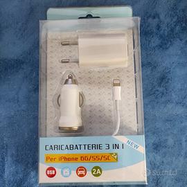 Set di 5 caricabatterie per smartphone, nuovi e completi di scatola d'imballo originale: caricabatterie da auto (presa accendisigari) e rete elettrica USB 2.0 - 2 Ah con cavetto lightning da 1 mt per iPhone 5 e 6; caricabatterie da auto (presa accendisigari) e rete elettrica USB 2.0 - 1 Ah con auricolari e cavetto da 1.2 mt per iPhone 3 e 4; caricabatterie da rete elettrica USB 2.0 - 2 Ah con cavetto micro USB da 1 mt; caricabatterie bianco da auto (presa accendisigari) con doppia uscita USB - 1 Ah e 2.1 Ah; caricabatterie nero da auto (presa accendisigari) con doppia uscita USB - 1 Ah e 2.1 Ah.