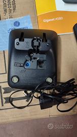 2 cordless A58H con base Siemens gigaset A580, neri, senza batterie, con istruzioni cavi telefonici. Su uno dei due cordless non è più visibile il marchio. Presenti piccoli segni legati all' usura.