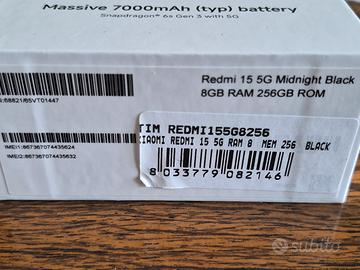 Vendo Smartphone Xiaomi Redmi 15 5G Ram 8 Mem 256 Black con cover nera originale. Acquistato in data 16 febbraio 2026 presso Unieuro Filiale di Cento (FE) mai utilizzato. Già dotato di pellicola. Garanzia inclusa