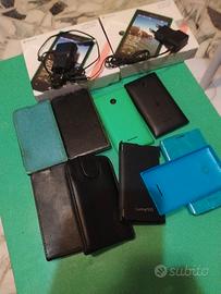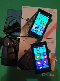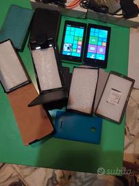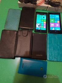 Telefono Microsoft Lumia 532 dual SIM, coppia, uno nero ed uno verde; due telefoni più 6 custodie specifiche per il modello di cui 2 usate e 4 del tutto nuove, inoltre una cover posteriore di colore azzurro.
