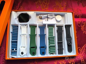 Questo dispositivo è uno Smartwatch Ultra 7in1 con display da 2.01 pollici e cinturini intercambiabili. Display: Ampio schermo da 2.01 pollici. Contenuto: Include 7 cinturini intercambiabili di diversi colori e stili. Funzionalità: Supporta chiamate Bluetooth, monitoraggio fitness e giochi integrati