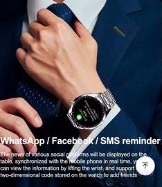 Smartwatch con cinturino in acciaio nero opaco, nuovo. Fornito con cinturino, carica batteria, attrezzo per regolazione cinturino ed istruzioni. Impermeabile. Le caratteristiche sono: Schermo AmOled 1,5", Sfondo personalizzato, effettua chiamate e risposte in Bluetooth direttamente dal polso, controllo della musica, legge i messaggi app e social, promemoria chiamate in arrivo, promemoria SMS, esercizi multipli, promemoria sveglia, promemoria sedentarietà, ricerca sul cellulare, riproduzione musicale, cronometro, conteggio passi, distanza, calorie, monitoraggio del sonno, monitoraggio salute, calendario , etc.
