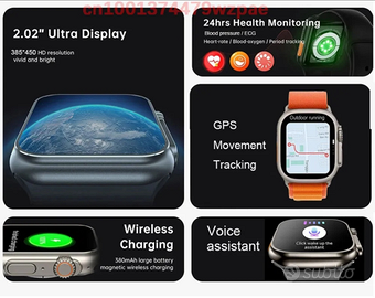 Smartwatch con risoluzione alta, visualizzazione messaggi SMS.. WhatsApp...FB e tutti i social, assistente vocale(comandi vocali stile Google voice o siri), chiamate e risposte direttamente dall'orologio, funzione cerca telefono (se dimentichi lo smartphone, lo fai suonare per ritrovarlo), tantissimi sfondi e persino sfondo creato con propria foto o immagine, ricarica wireless e in più tutte le varie misurazioni e sport.