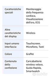 Smartwatch Samsung Galaxy Watch 5 40mm bluetooth grafite. Usato - in buone condizioni, presenta i normali segni di usura quotidiana. In regalo - 1 cinturino di ricambio. Confezione originale. Display Super AMOLED da 1,2 pollici - Memoria interna 16Gb - Sistema operativo Wear by Samsung OneUI - Bixby controllo vocale - Impermeabile fino a 5Atm - IP68/MIL-STD-810G - Lettore musicale - Monitoraggio attività giornaliera, ESG, Frequenza cardiaca - Ossigenazione del sangue - Samsung Pay Specifiche tecniche GALAXY WATCH5 40MM BT, 1.5+16 GB, GRAPHITE Smartwatch Display Super AMOLED da 1,2 pollici - risoluzione 396x396 pixel - Touchscreen - Processore Exynos W920 Dual Core 1.18 GHz - RAM 1,5 GB - Capacità di archiviazione 16 GB - Sistema Operativo Wear OS powered by Samsung One UI Watch 4.5 - Applicazioni installate: Always On Display,Bixby - Controlli vocali - Inserimento vocale- Registratore vocale - Blocco in acqua Bussola - Scocca in alluminio - Certificazione in acqua fino a 5 ATM / IP68 / MIL-STD-810G - Connessione remota - Galleria / Lettore musicale / Controller Buds / Controller Fotocamera Modalità Teatro / Modalità Riposo / Non disturbare Orologio / Cronometro / Timer / Sveglia / Fusi orari Play Store / Maps / Messaggi Android / Samsung Global Goals Promemoria / Calendario / Meteo / Calcolatrice - Rilevamento cadute / Invia richieste SOS (Combinazione tasti / Rilevamento caduta) - Risparmio energetico / Rubrica / Telefono / Messaggi / Microsoft Outlook/ Samsung Pay / Samsu Dimensioni - Peso Peso-Kg 0,028 Colore GRAPHITE