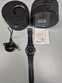 Smartwatch Samsung Gear S3 frontier. Ottime condizioni. Perfettamente funzionante. Completo nella sua confezione originale, con accessori originali. Display touch 1.3” (360 x 360 pixel) AOD Certificazione IP68 Memoria 4 GB Processore Dual Core Connettività: bluetooth 4.2 connesso a smartphone (LTE, Wi-Fi b/g/n) + NFC, MST, GPS/Glonass Batteria 380 mAh Sensori: accelerometro, giroscopio, barometro, cardiofrequenzimetro, luce ambiente.
