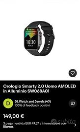 Vendo Smartwatch, marca SMARTY 2.0, modello SW068. Vendo per doppio regalo. Mai usato, mai caricato, è stata solo aperta la scatola, ancora garanzia attiva pe 18 mesi. Prezzo del nuovo 149,00€. (allego anche foto da internet del nuovo, in più il mio ha un cinturino metallico più costoso di quello in gomma)