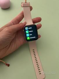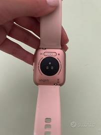 Smartwatch perfettamente funzionante, completo di cavo di ricarica. Colore rosa chiaro.