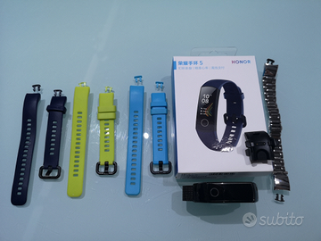 Nuovissimo honor band 5 corredato da ben 5 cinturini acciaio nero, acciaio argento, silicone verde-blu-celeste.
