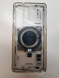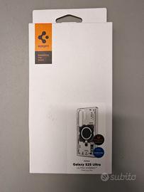 Spigen Cover Ultra Hybrid MagFit per S25 Ultra. Nuova (ancora con pellicole protettive originali), anello magnetico magsafe, con effetto di vista circuiti interni in rilievo al tatto, colore neo one (trasparente con serigrafie componenti in rilievo azzurro/grigio). Aggiungo 2 cover in vetro 9H in confezione con accessorio per l'applicazione dritta e senza bolle, con due vetri protettivi (neri) per lenti posteriori.