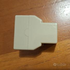 Splitter RJ11, con una presa RJ11 femmina da un lato e due prese RJ11 femmina dall'altro. Di plastica color beige.
