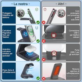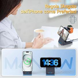 【Caricatore Wireless per iphone】 MANKIW stazione ricarica per apple offre 3 punti di ricarica, permettendoti di dire addio ai cavi multiplti ingombrati e di caricare contemporaneamente il tuo iPhone, iWatch e AirPods. Supporta solo iPhone 17/16/15/14/13/12 series, iWatch 11/10/9/8/7/6/5/4/3/2/SE/Ultra/Ultra 2, AirPods 2/3/4/Pro/Pro 2(Nota: AirPods 2/3/4 sono disponibili in 2 versioni, assicurati di utilizzare la custodia di ricarica wireless)