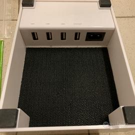 Usata in ottime condizioni Descrizione Avantree PowerHouse charging station, 22.5W 5V/4.5A universale con 4 porte USB, puo supportare e ricaricare 4 dispositivi contemporaneamente Caratteristiche del prodotto * elevata potenza 4.5A, ricarica rapida dei tuoi tablet e smartphone * Configurazione utente, colori alla moda * Compatto e design salvaspazio * Grazie ad UNA PORTA INTELLIGENTE interna con controllo IC in uscita, stabilizza la corrente in uscita * Il sistema in Velcro gestisce i cavi e li nasconde per mantenere la scrivania ordinata * Dotata di due cavetti di ricarica micro USB Dettagli * Input: AC 100-240V, 50/60Hz, 0.6A max * Output: 5V, total 4.5A (alloca 4.5A a 4 porte USB) * Single USB max output 2.4Amp * Dimensioni: 15.4*11.4*8.5cm * Peso: 305g circa Contenuto della scatola * Avantree PowerHouse * set di cover in silicone * cavo di alimentazione AC (1.5M) * 2 cavi di ricarica micro USB