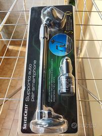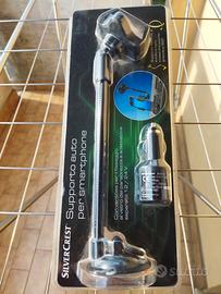 Supporto Auto per Smatrfhone. . Ricarica tramite USB. Alimentatore separato 12/24 Vcc con fusibile integrato. Morsetti di fissaggio in gomma regolabili.. Accessori Mini USB su cavo USB, Micro usb su cavo USB. Nuovo mai usato, in confezione mai aperto.Supporto flessibile a collo di cigno e base di supporto girevole a 360 gradi con ventosa per il fissaggio al parabrezza.