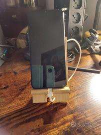 Pratico supporto da tavolo in bambù per smartphone che permette la ricarica grazie al passaggio del filo nella parte inferiore come da foto. Davvero comodo e bello. NUOVO ancora imballato.