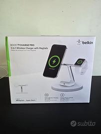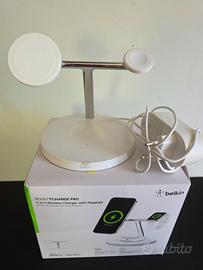 Il supporto BoostCharge Pro 3 in 1 di Belkin con ricarica magnetica Qi2 ha un braccio a inclinazione regolabile con un modulo magnetico per iPhone e una base piccola ma solidissima. Ti offre 15W di potenza per ricaricare in wireless un iPhone 15, iPhone 14 o un altro modello con MagSafe, e allo stesso tempo fare il pieno a tutta velocità a un Apple Watch compatibile con la ricarica rapida, come Apple Watch Ultra 2 o Apple Watch Series 9. Puoi caricare anche un terzo dispositivo, come un paio di AirPods, di AirPods Pro o un altro dispositivo compatibile con la ricarica wireless Qi: basta appoggiarlo sul modulo Qi nella base. Completo di scatola originale. CARATTERISTICHE: Ricarica in wireless 3 dispositivi alla volta: iPhone, Apple Watch e AirPods. Angolo di inclinazione di 90° per sistemare l’iPhone come preferisci. Fino a 15W di potenza per ricaricare velocemente in wireless il tuo iPhone. Compatibile con la modalità StandBy per un’esperienza a tutto schermo quando ricarichi l’iPhone in orizzontale. Certificato Qi2. Compatibile con MagSafe. Dimensioni e peso Altezza: 11,9 cm Lunghezza: 12,2 cm Larghezza: 11,9 cm Peso: 610 g Lunghezza del cavo: 152 cm Elenco dei dispostivi compatibili sul sito Apple