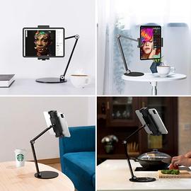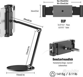 Vendo supporto per tablet in alluminio resistente con braccio regolabile a due livelli, design elegante e super stabile.