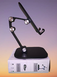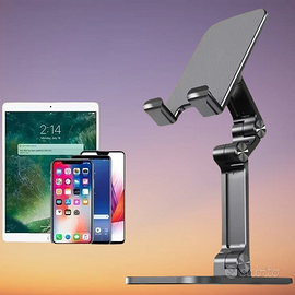 Supporto pieghevole e regolabile da scrivania, compatibile con iPhone, iPad e tablet di varie dimensioni.