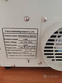 Fornello per eseguire saldature SMD su circuiti stampati. É stato utilizzato 2 volte ed é in condizioni perfette. Inclusi 4 piedini in ceramica per sospendere il circuito e farlo riscaldare in modo più uniforme. MODIFICATO: -Sostituito ladesivo interno per uno di maggior qualità e resistenza (kapton) -Aggiunto sensore di temperatura ambiente per esecuzione più controllata della saldatura -Sostituito firmware proprietario con uno migliore per maggior personalizzazione e controllo sul dispositivo (assieme ad alcune ottimizzazioni come la ventola di raffreddamento utilizzata con maggiore efficienza) FUNZIONA CON 120V INVERTER NECESSARIO