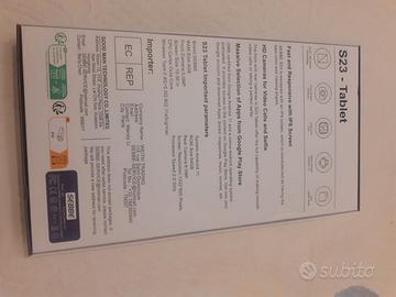 Vendo tablet Sebbe S23 con schermo 10,36" IPS, 4GB RAM, 64GB memoria, Android 11 e Wi-Fi Dual Band. Fotocamera frontale 5MP, posteriore HD. Caricabatterie non incluso. Perfettamente funzionante, con scatola.