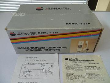 Vendo coppia di telefoni wireless telephone (carry phone) interphone + telefone, model T - 83 M, fabbricato dalla ditta Alpha Tec a Hong-Kong nei primi anni 80, vintage. Perfettamente funzionanti, con istruzioni e scatola originali, nuovi mai usati.