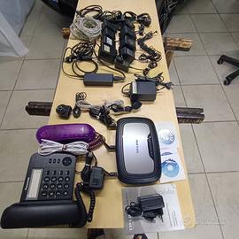 Materiale vario : telefoni analogici Panasonic KS-TS520EX e Brondi, modem router TpLink dual band wireless con relativi accessori per collegamento e alimentazione elettrica. Trasformatori varie tipologie e voltaggio - per portatile asus mod. PA1750-29 N 75W - e HP, a voltaggio variabile con relativi spinotti di collegamento, ecc . cavetteria varia . Il tutto come meglio si vede in foto. VENDO TUTTO IN BLOCCO