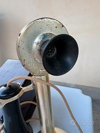 Telefono d’epoca a candeliere con disco combinatore e scatola suoneria in legno con doppia campana in ottone (anni ’20-’30 circa).