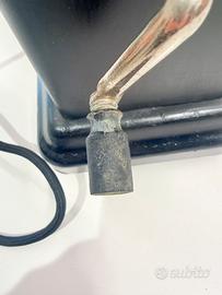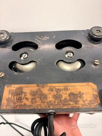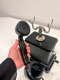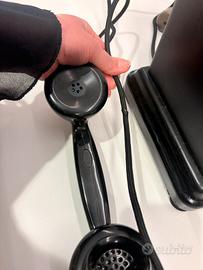 Telefono da campo a chiamata magnetica, a batteria locale (BL), in bachelite e metallo nero, marchiato FATME. Modello d’epoca attribuito agli anni 1920/1930. Non testato, perché non disponiamo di impianto o linea idonea per provarlo. La manovella è presente. Presenta segni visibili del tempo e dell’uso, come da foto: usura generale sulla bachelite e sulle parti metalliche, segni e abrasioni sulla base, ossidazione/usura sulla manovella e sul supporto della cornetta, fondo ed etichetta vissuti, oltre a normali segni del tempo su cornetta, cavo e spina d’epoca. Completo di cornetta, cavo e spina. Le foto fanno parte della descrizione.