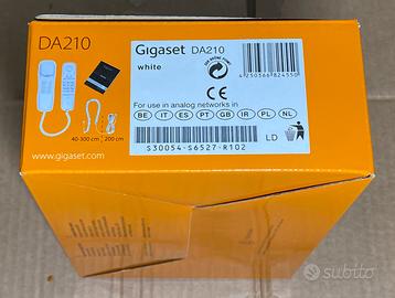 APPARECCHIO TELEFONICO PER RETE TELEFONICA FISSA CON FILO PLUG RJ11, DA TAVOLO OPPURE APPENDIBILE IDEALE ANCHE COME TELEFONO DI EMERGENZA PER ASCENSORI E MONTACARICHI. MODELLO GIGASET DA210 COLORE BIANCO, GERMAN TECHNOLOGY.