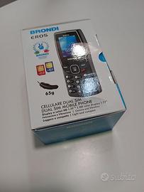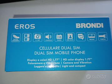 Telefono Brondi Eros Dual SIM con fotocamera, radio FM, rubrica 500 numeri, vivavoce, torcia LED, slot per memoria aggiuntiva, connettore cuffia, 180 min di conversazione, sede per due SIM, pesso: 65 gr. Manuale in italiano e inglese. Ideae per perpose anziane e con problemi di vista. #telefono #cellulare #phone