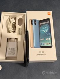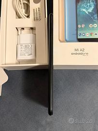 Smartphone Xiaomi Mi A2 Lite in color nero. La confezione include il telefono, il cavo di ricarica, l'adattatore di corrente e lo strumento per l'estrazione della SIM.