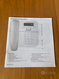 Telefono fisso che non necessita di presa di corrente perchè si alimenta con il cavo del doppino telefonico in dotazione (quando va via la corrente il telefono funziona). È presente anche il libretto di istruzioni.