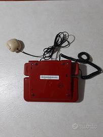 Telefono con tastiera di colore rosso con presa tripolare per il collegamento alla rete in scatola originale e foglio di istruzioni.