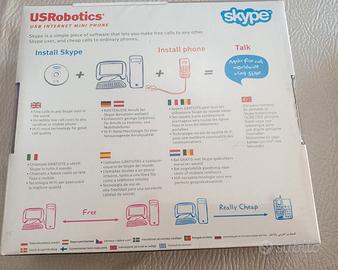 L’USB Internet Phone di USRobotics (codice USR809600, USR809601A, USR809602) è un telefono che si connette al vostro computer tramite la porta USB e che, essendo stato ideato per funzionare con il programma Skype, vi permette di telefonare gratis attraverso Internet. Tutto ciò di cui avete bisogno è un computer, una connessione Internet a banda larga e Skype, (alternativamente è anche possibile utilizzare programmi analoghi quali MSN, AOL, Yahoo e Google Talk).