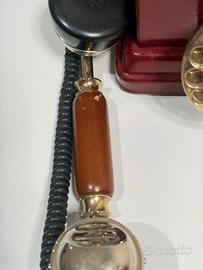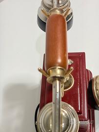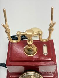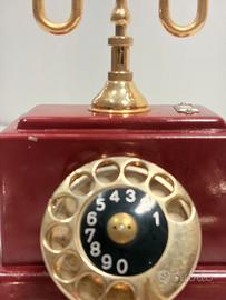 Telefono fisso vintage a disco da tavolo, colore rosso bordeaux, con dettagli metallici e impugnatura effetto legno. Prodotto negli anni ’70 in stile anni ’50, molto bello anche come oggetto da arredamento o collezione. Il disco gira e torna correttamente. Non è stato testato su linea telefonica, quindi viene venduto come non testato. Presenta normali segni del tempo e dell’uso, visibili nelle foto, soprattutto sulle parti metalliche, sul disco frontale, sulla base e sull’impugnatura. Completo di ricevitore, cavo a spirale e spina tripolare d’epoca. Ideale per arredamento vintage/retrò, vetrine, studi, negozi o collezionisti. Le foto fanno parte della descrizione.