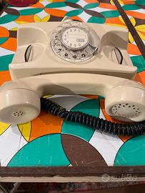 Telefono fisso GTE Starlite, prodotto negli anni ’70. Un modello con il disco combinatore rotante,sotto la cornetta. Per chi ama il modernariato e un arredo space age di gusto.