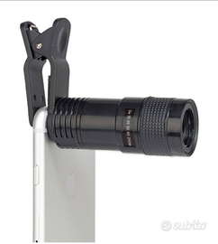 Un telescopio portatile da utilizzare come accessorio dello smartphone. Dotato di 8 ingrandimenti da circa 20 cm a 2 metri. La distanza minima di messa a fuoco è 3 metri. Compatibile con tutti i tipi di smartphone. Un copriobiettivo e un panno in microfibra per la pulizia sono inclusi nella confezione.