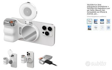 Kit per Selfie con comando (anche a distanza di 10 metri) e luce magnetica. Nuovo imballato vendo per regalo che non utilizzo Descrizione esatta : TELESIN Fun Shot Impugnatura Smartphone + TELESIN C03 Magnetica Luce per Selfie (Bianco) Set, Compatibile con iPhone & Android, per Selfie/Fotografia/TikTok/Chiamate Zoom/ alte info su Amazon NUOVO ANCORA DA APRIRE