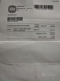 Xiaomi 14 Ultra White - Telefono tenuto in maniera maniacale, ottime condizioni con Kit fotografico, contattare su WhatsApp grazie Scheda Tecnica •Display: 6,73" LTPO AMOLED WQHD+ (3200×1440 px) - 120Hz adattivo, luminosità picco 3000 nit, Dolby Vision, HDR10+ •Processore: Qualcomm Snapdragon 8 Gen 3 (4nm) Octa-core fino a 3,3 GHz •RAM: 16 GB LPDDR5X •Storage: 512 GB UFS 4.0 •Sistema operativo: HyperOS (Android 14) Fotocamere posteriori (Quad-camera Leica Summilux): •50MP principale f/1.6-4.0, sensore 1" Sony LYT-900, OIS •50MP ultra-grandangolare f/1.8 •50MP teleobiettivo 3,2x, OIS •50MP periscopio 5x, OIS •Video fino a 8K@30fps e 4K@120fps Fotocamera frontale: 32MP, 4K@60fps • Batteria: 5000 mAh - Ricarica cablata 90W, wireless 80W, ricarica inversa • Connettività: 5G, Wi-Fi 7, Bluetooth 5.4, NFC, Dual SIM (Nano-SIM) • Resistenza: Certificazione IP68 •Design: Telaio alluminio 6M42, Xiaomi Shield Glass, pelle vegana nano-tech • Dimensioni: 161,4 x 75,3 × 9,2 mm - Peso: ~224g